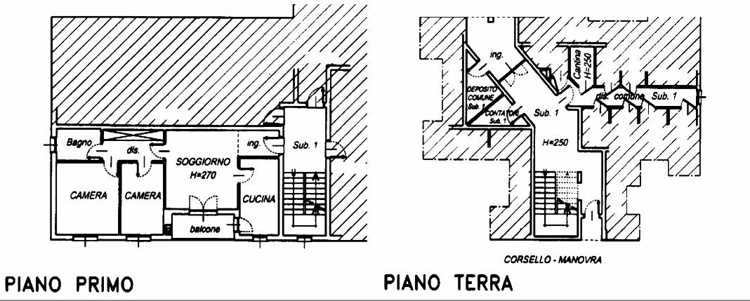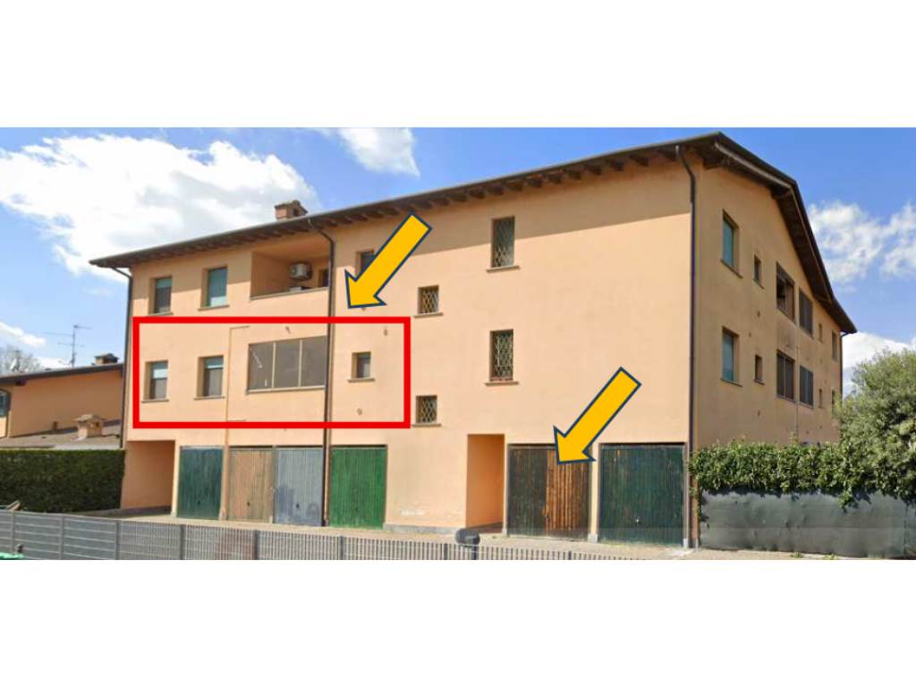 Unità abitativa al piano primo di contesto condominiale composta da ingresso, soggiorno, cucina, disimpegno, bagno, due camere e balcone con annesso locale cantina al piano terra; locale autorimessa al piano terra composto da un unico locale.