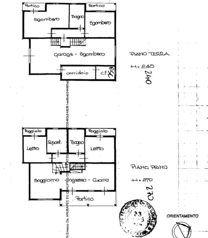 - P. Seminterrato/P.T. garage/locale di sgombero, disimpegno, 2 locali sgombero, bagno, corridoio/centrale termica, vano scala, 2 portici;